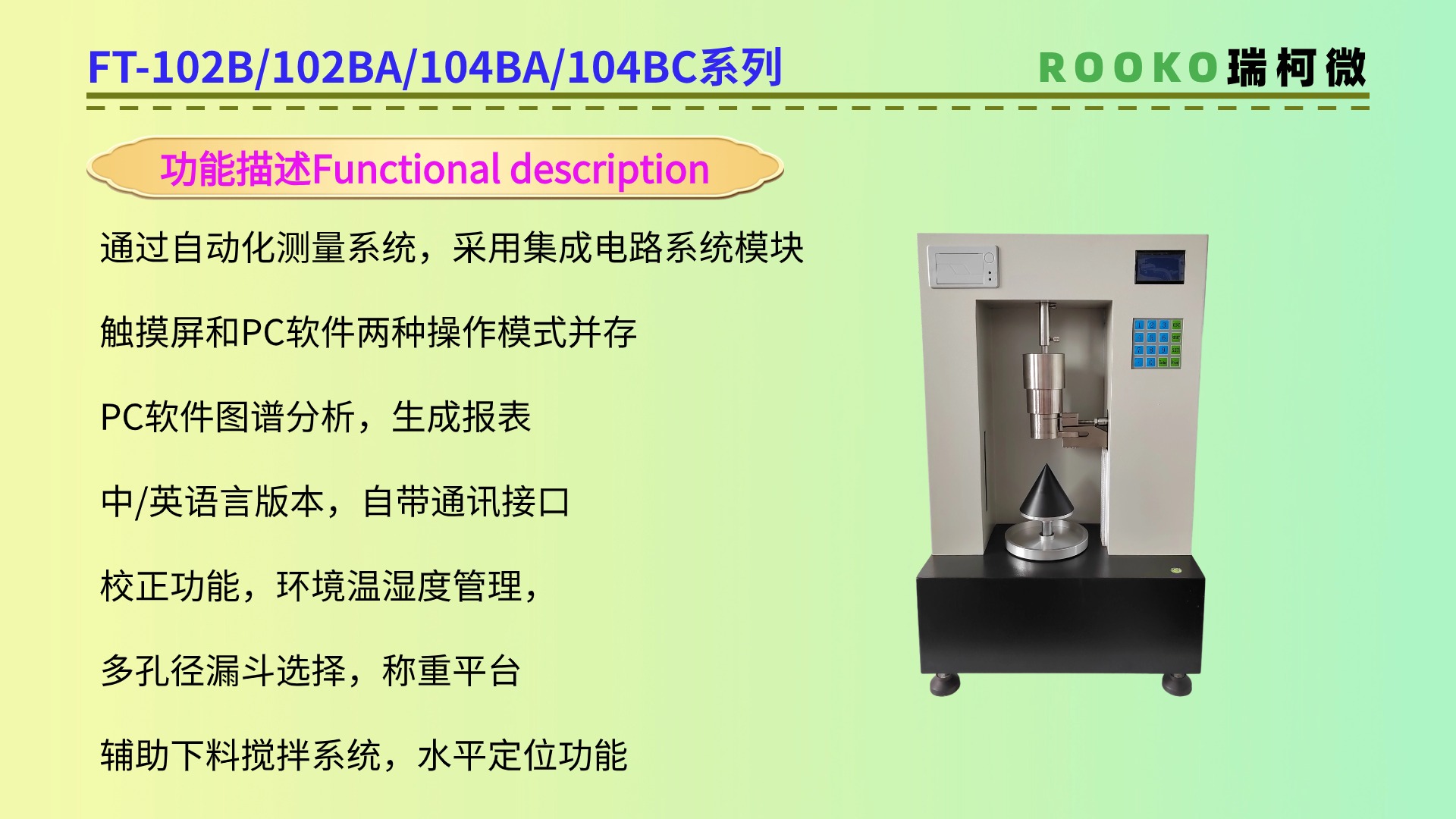 特點:休止角測定儀通常具有測量準確、操作簡便、重復性好等特點。此外,一些休止角測定儀還具有自動化測量、數(shù)據(jù)記錄和分析等功能如FT-104BA。