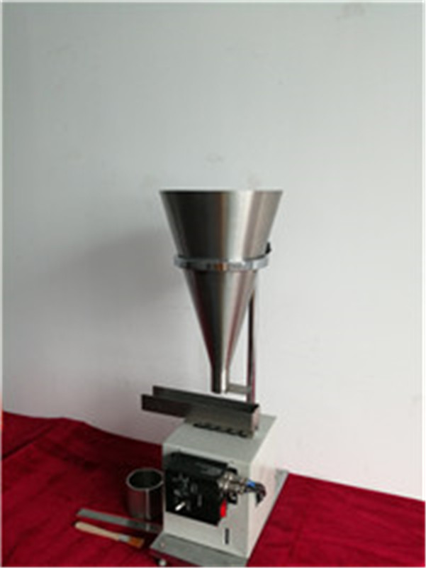 工作原理:將待測的微粉裝入漏斗,微粉在自身的堆積作用下處于堆積狀態(tài)。當(dāng)電磁振蕩器啟動后,微粉在電磁振動的作用下,途徑流入測量桶中,將落入到測量筒中的微粉刮平,在天平上稱取刮平后測量筒中的微粉質(zhì)量,再除以測量筒的容積,就可以測出待測微粉的堆積密度