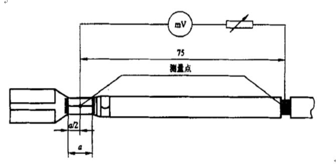 如上示兩圖中,圖1導(dǎo)線首端帶有端子,測量75mm長帶端子導(dǎo)線的兩端壓降,記錄數(shù)據(jù)備用;圖2中導(dǎo)線不帶端子,直接測量75mm長導(dǎo)線的兩端壓降,記錄數(shù)據(jù);用圖1中測得的壓降減去圖2中測得的壓降即為被測端子的壓降。